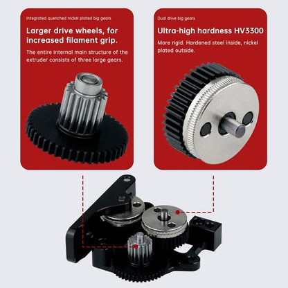 Adopting high-quality hardened steel nickel-plated gear set, and the hardened steel material is made of wear-resistant material, which meets the common consumables PLA, ABS, PETG, TPU, PP, PC, Nylon, PEEK, PEI, except for carbon fiber. The positioning pin adopts the precision grinding process, quenched and hardened, the hardness is 48-50 degrees, and it is tough and wear-resistant.