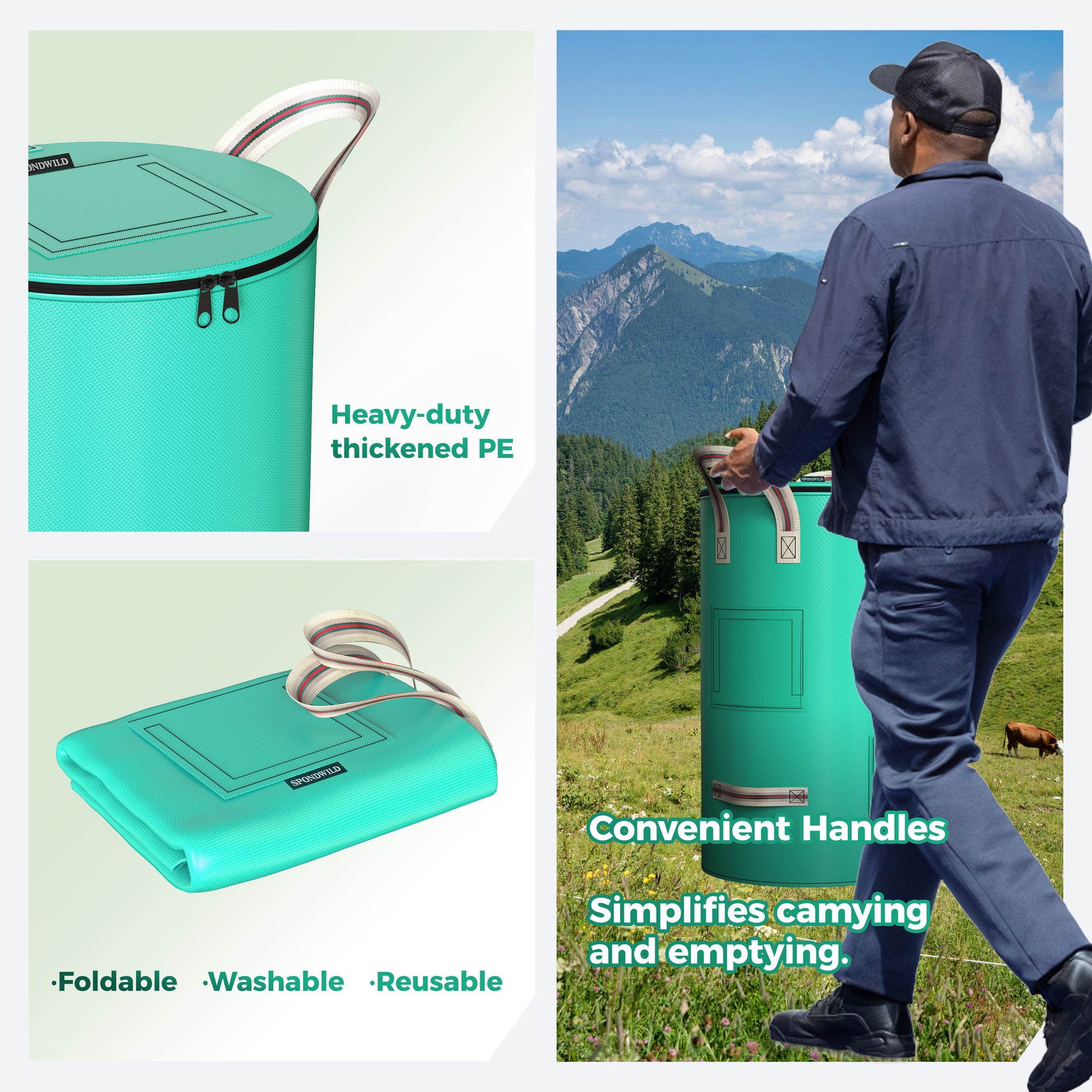 Equipped with 4 heavy-duty handles, each reinforced with double-needle stitching for maximum durability. Top handles let you lift the full bag effortlessly (even when heavy), while bottom handles provide a secure grip for controlled dumping—no straining or accidental spills when emptying waste